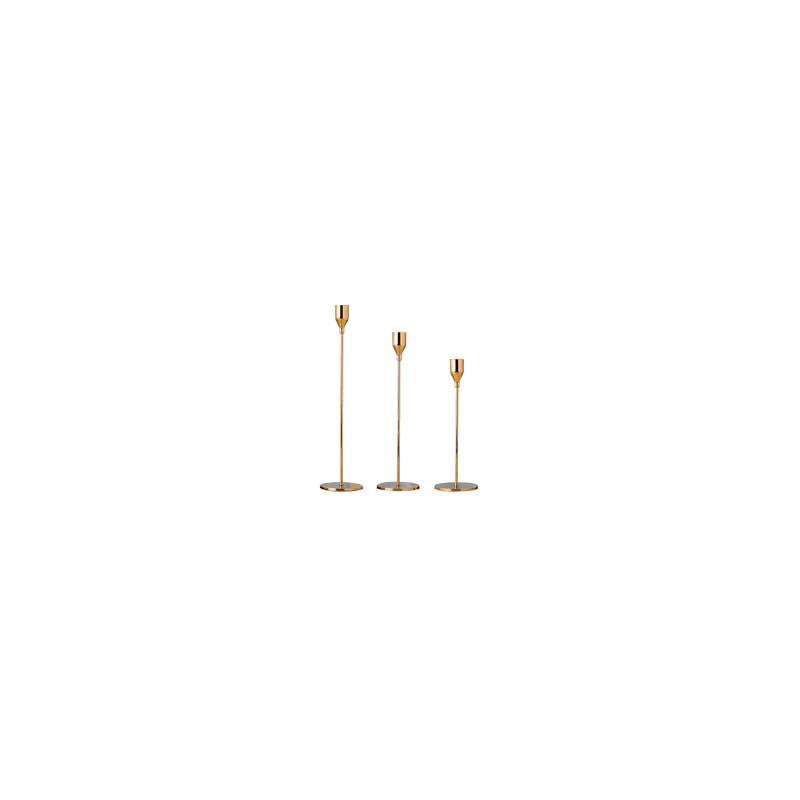 Set de 3 bougeoir couleur or, idéal pour illuminer votre événement. Dimension: 18/23/27 cm de hauteur. Une bougie taille standard est appropriée pour ce bougeoir.