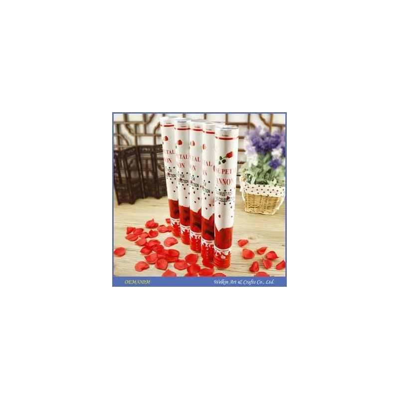 Canon à pétales de roses rouge de 30cm. . Le canon projette les confettis à 8 mètres de haut environ ! Fonctionne avec air comprimé logé dans la poignée, intégrée au canon. Contient des pétales rouges de rose en tissu. Vendue pae 5 pièces.